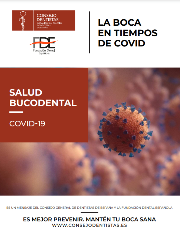 El Consejo General de Dentistas y la Fundación Dental Española (FDE) han elaborado la guía “La boca en tiempos de COVID-19”, donde se explican los aspectos más importantes que relacionan la salud oral con la COVID-19.La finalidad de esta publicación es hacer llegar a la población la información más relevante del SARS-CoV-2 y los problemas bucodentales de una forma más visual y accesib...