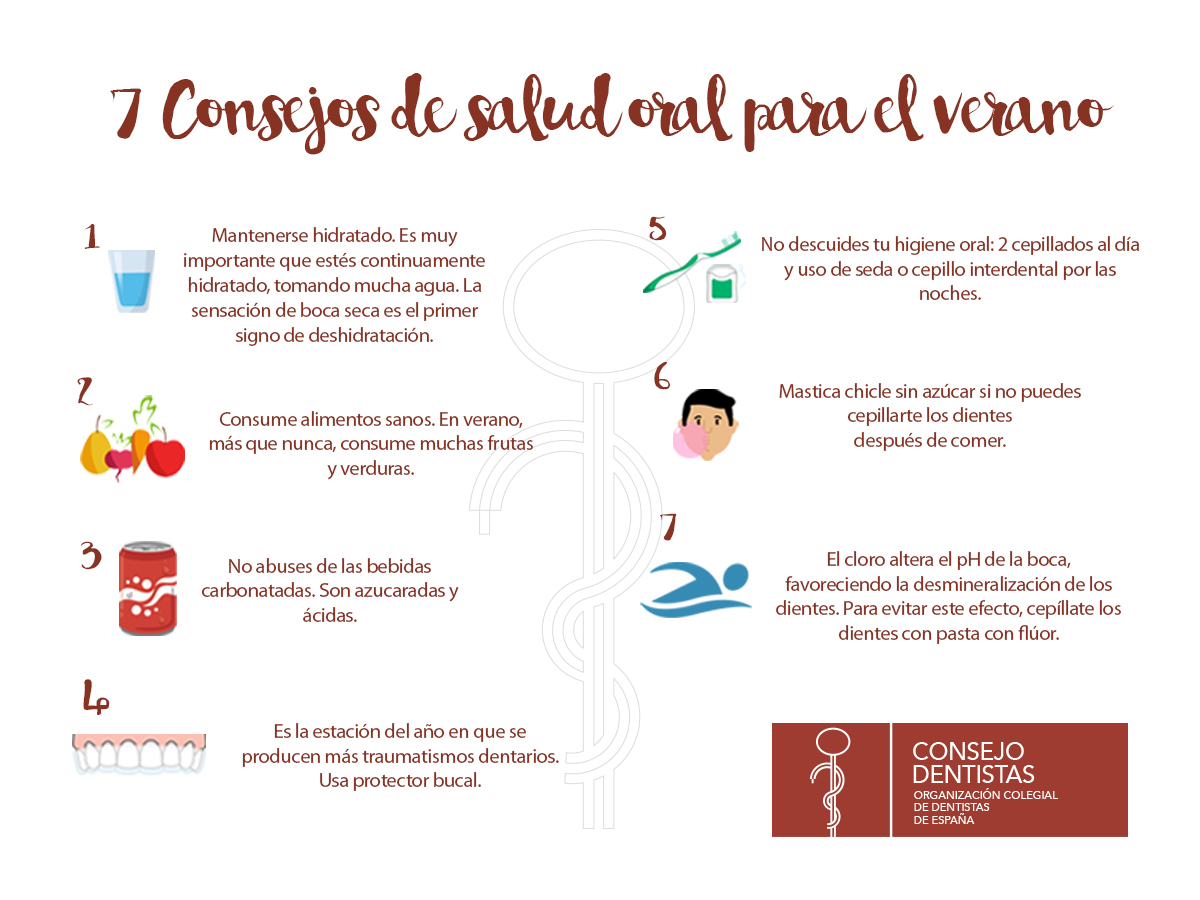 En verano, es habitual comer fuera de casa, consumir más bebidas carbonatadas y se suelen olvidar o relajar los hábitos de higiene bucodental. El Consejo General de Dentistas de España y la Fundación Dental Española recuerdan que la salud oral no debe descuidarse en la época estival y aconsejan lo siguiente: 1. Permanece hidratado: beber mucha agua para estar continuame...
